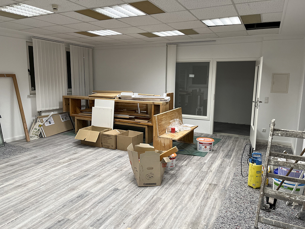 Der Umzug der Geschäftsstelle aus der roten Hütte vor dem Budocentrum in die alten/neuen Räume des Budocentrums hat bereits begonnen und soll bis Ende Februar 2024 abgeschlossen sein. Der Fußboden im Kraftraum ist ebenfalls fertig versiegelt worden.