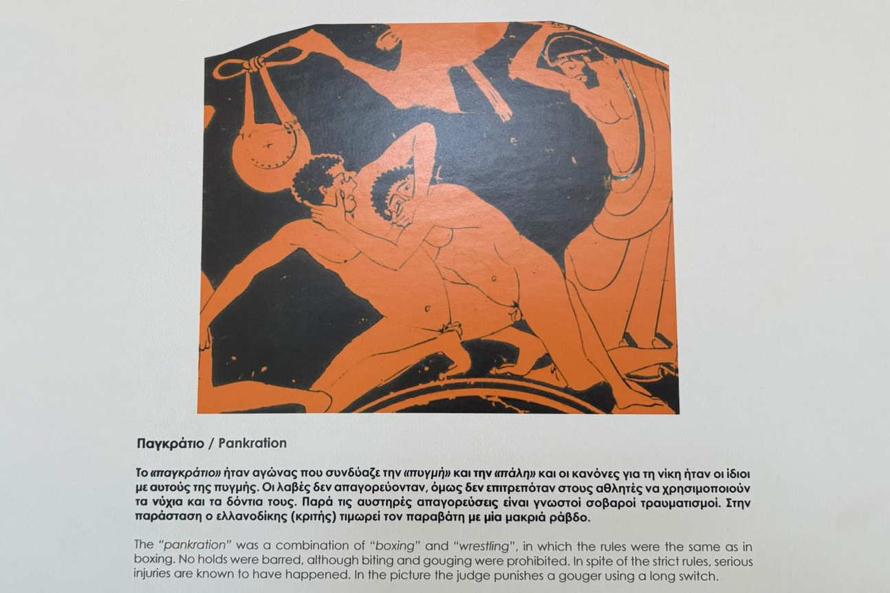 Das Pankration wurde demnach vom mythologischen Theseus erfunden, als er ohne Waffen gegen den Minotaurus kämpfen musste. Dabei handelte es sich um eine äußerst brutale Verbindung aus Ringen und Boxen mit bloßen Händen, die oft mit schweren Verletzungen oder dem Tod endete. In heutiger Zeit gibt es Bestrebungen, das Pankration in einer reglementierten Form, ähnlich dem Ju-Jutsu Allkampf, dem brasilianischen Vale Tudo, den Mixed Martial Arts (MMA) oder Freefights wieder olympisch zu machen. Weitere Infos zu Pankration siehe: Wikipedia