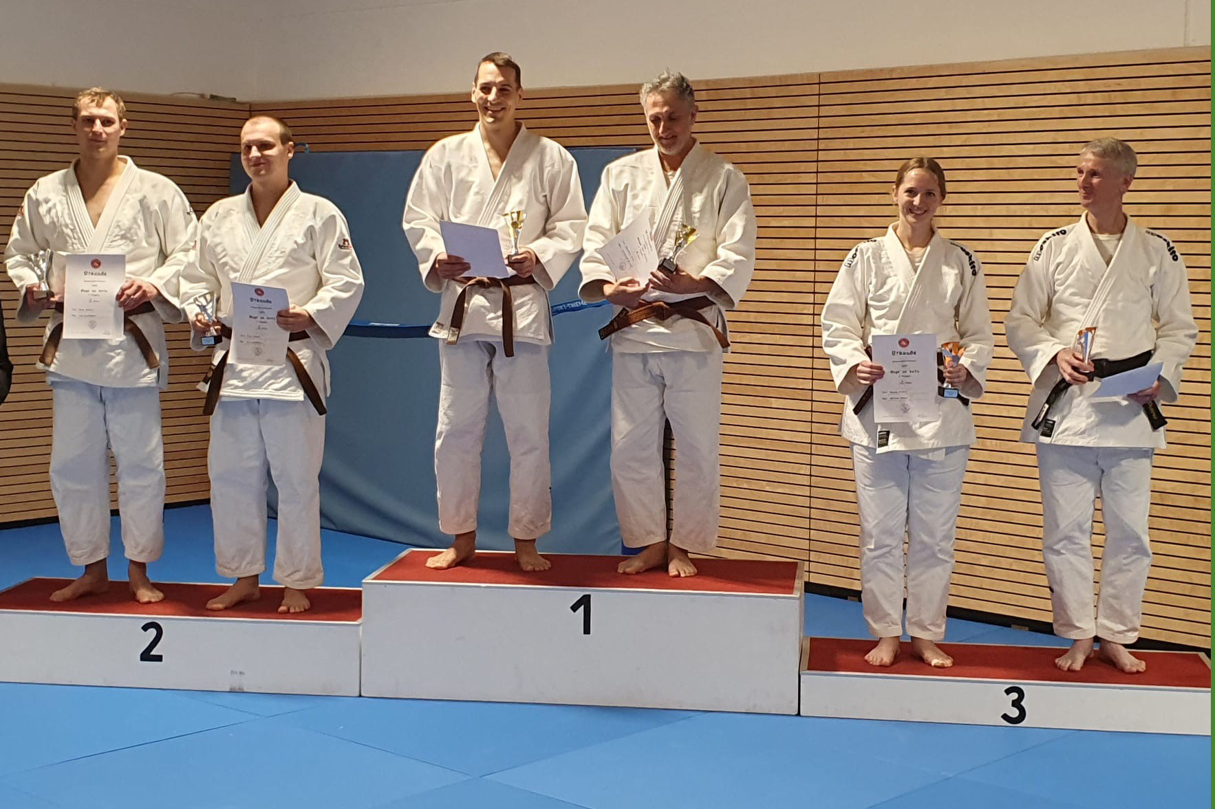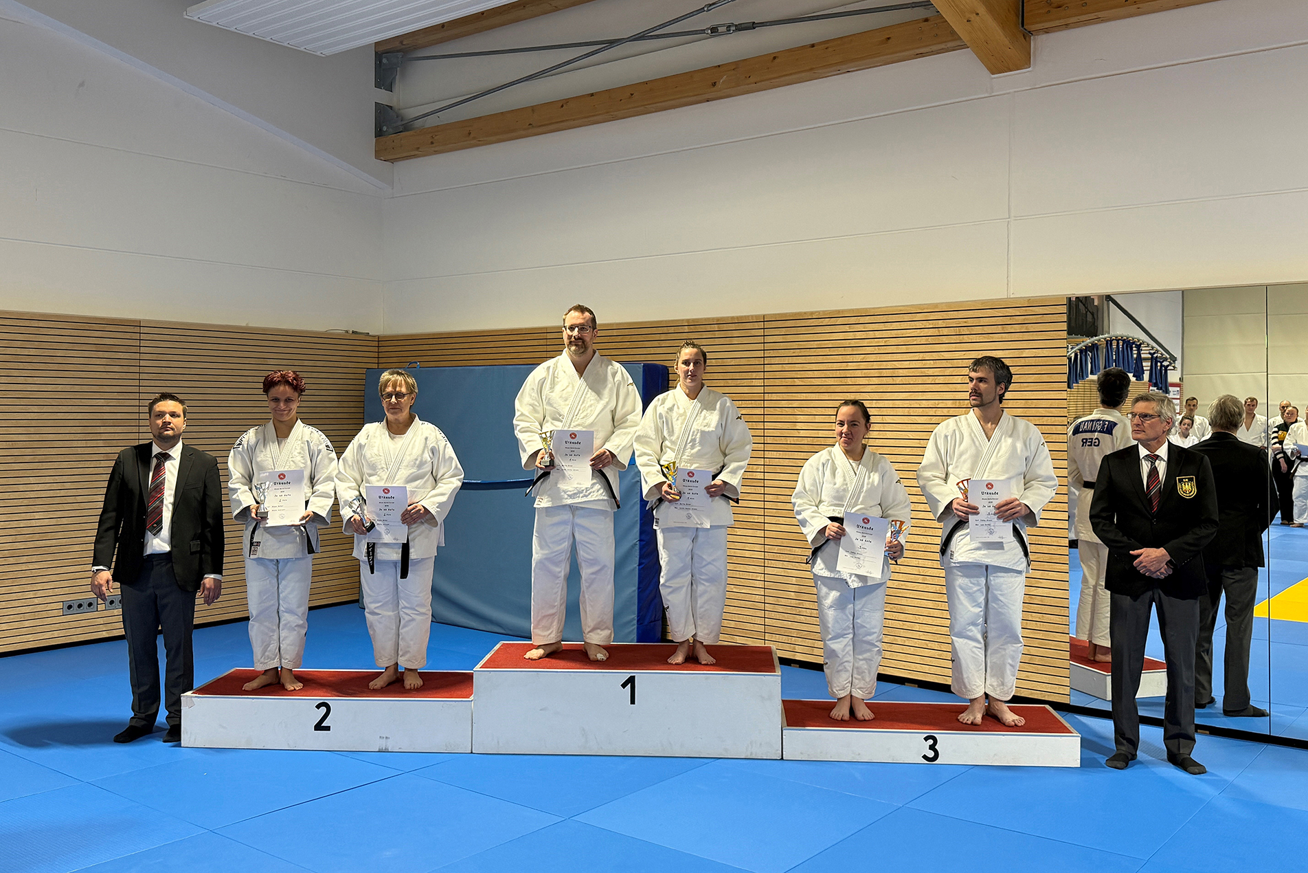 Weiter ging es mit Christophe Sorenti und Benedict Broy in der Nage no kata (Form des Werfens) mit der Modus Demonstration der ersten drei Gruppen. Nach 18 Techniken erlangten sie den vierten Platz ganz knapp hinter den später Drittplatzierten. In umgekehrter Folge mit Benedict Broy als Werfendem und Christophe Sorenti als Geworfenem legten die beiden später aber noch mal deutlich einen drauf und sicherten sich verdientermaßen den ersten Platz in dieser Kategorie.